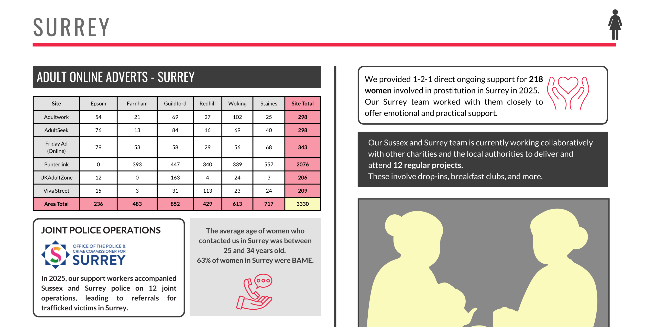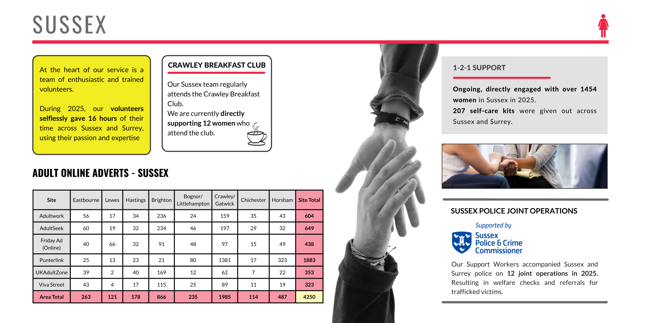 Our frontline outreach teams operate across the South East in Sussex, Surrey, Medway, East Kent, and London. They also operate in Yorkshire, Cumbria, and Lancashire. Year on year, our reach and impact, including the number of referrals, joint police operations, and client contacts, has significantly increased.