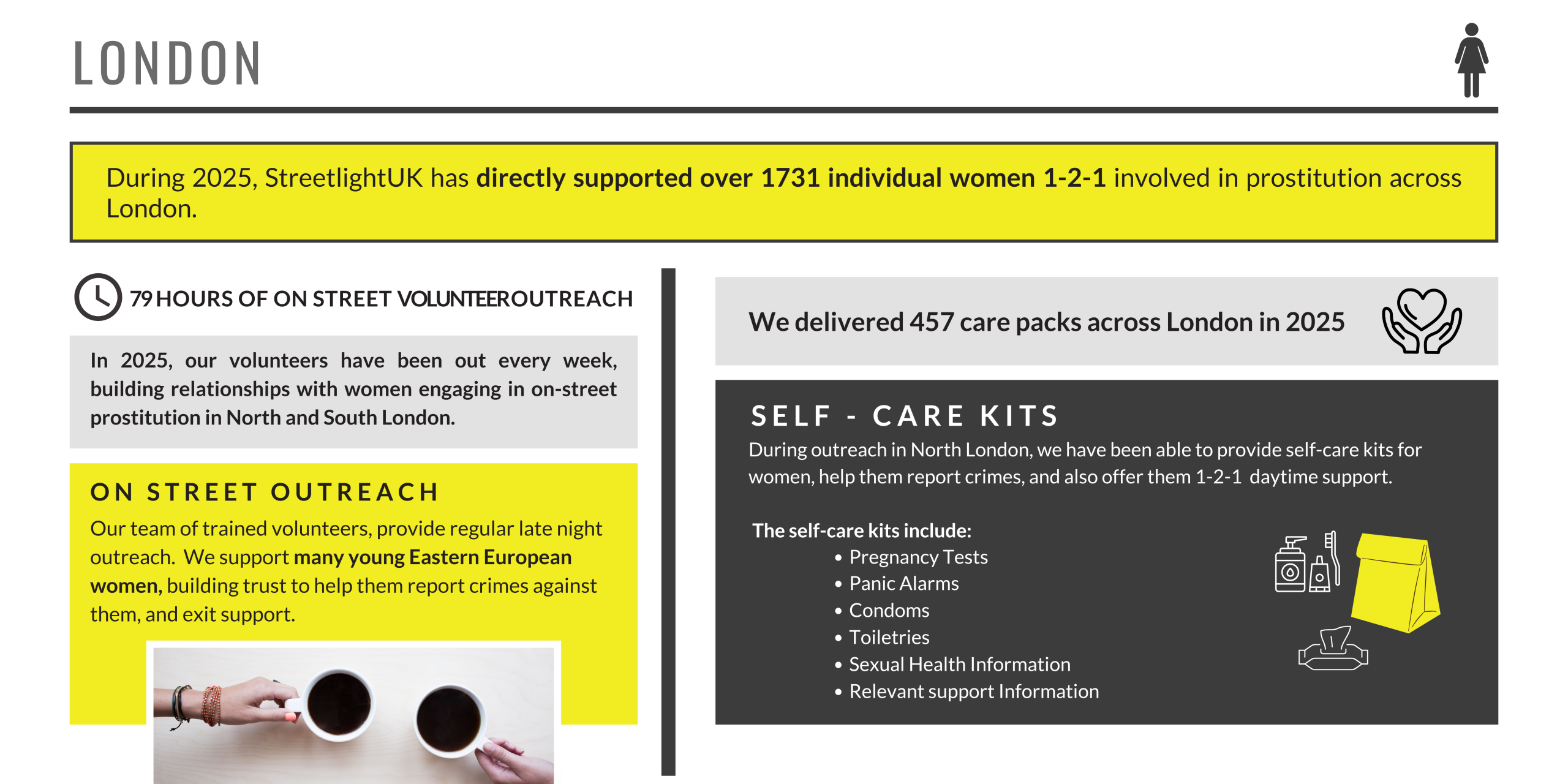 We place women’s dignity and choices at the center of what we do, and we work hard to maximize access to services through online platforms, joint police operations, and self-referrals. Much of our work is done in partnership with local agencies, enabling us to provide a comprehensive service for women. Together with our partners, we work hard to reduce the risk and impact of violence against women and girls and the associated harms of prostitution.