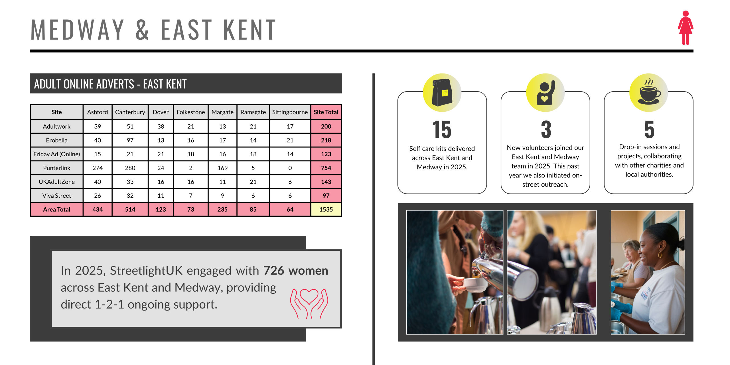 Our frontline outreach teams operate across the South East in Sussex, Surrey, Medway, East Kent, and London. They also operate in Yorkshire, Cumbria, and Lancashire. Year on year, our reach and impact, including the number of referrals, joint police operations, and client contacts, have significantly increased.
